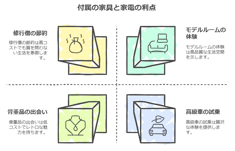 ほとんどのWebサイトでは、家具家電付きであることを、単なるメリットとして紹介しています。しかし、見方を変えれば、これは、高価な家具家電を、無料でレンタルできるサービスとも言えます。まるで、高級車に試乗するような、贅沢な体験ができるのです。