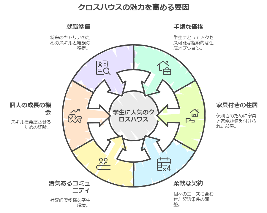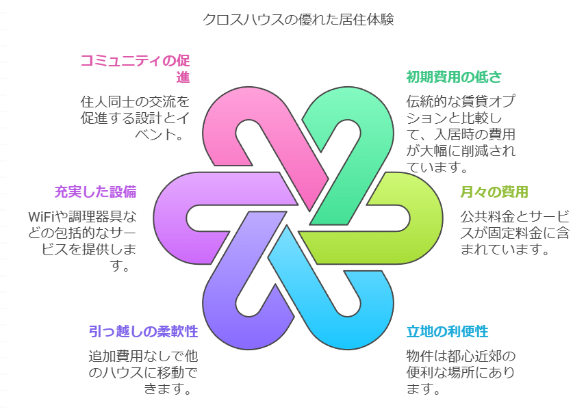 クロスハウスは、物件数が多く、選択肢が豊富です。また、初期費用が安く、契約期間が柔軟である点が、大きな特徴です。さらに、入居者同士のコミュニティが活発で、イベントなども多く開催されています。