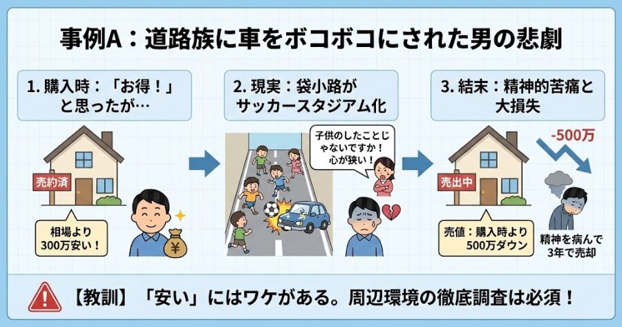 相場より300万安い土地を購入。 しかし、そこは袋小路で、近所の子供たちのサッカースタジアムと化していた。 新車にボールをぶつけられ、注意すると親が出てきて「子供のしたことじゃないですか! 心が狭い!」と逆ギレ。