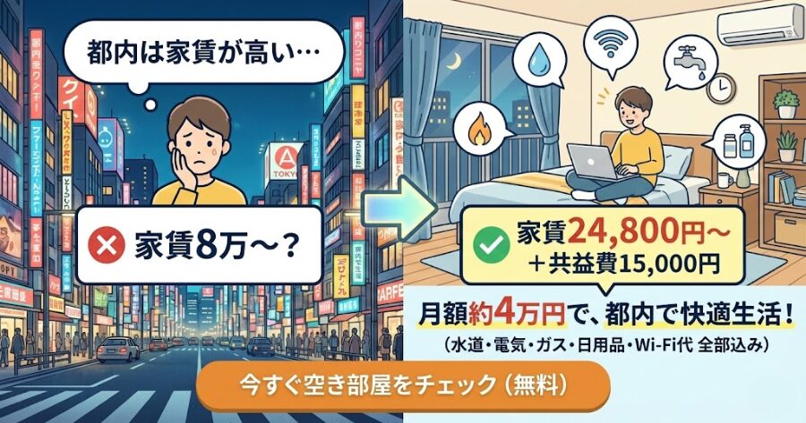 これに共益費が一律15,000円かかるが、ここには「水道代・電気代・ガス代・日用品(トイレットペーパー等)・Wi-Fi代」が全部含まれとる 。