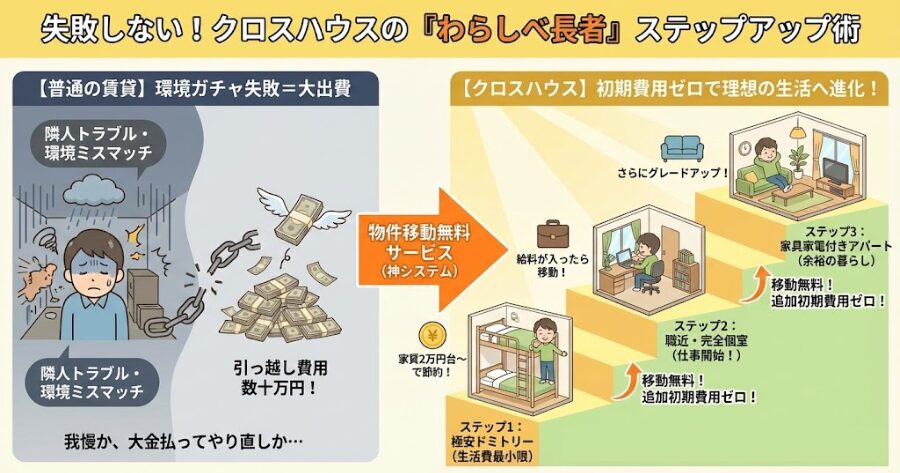 それが、敷金礼金ゼロ・保証人不要の『クロスハウス』を使った戦略的仮住まい術じゃ。