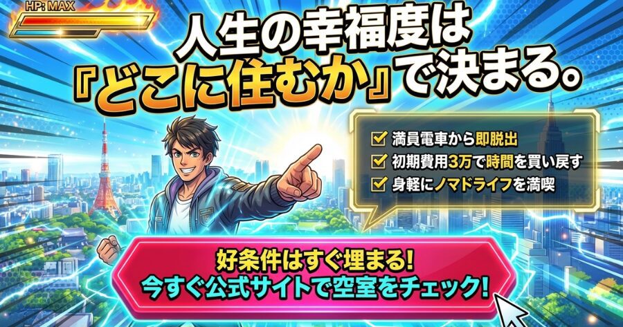 「いつか引っ越そう」と迷っている間にも貴重な時間と体力は奪われ続けているからこそ現状から一歩踏み出し、自分の自由な時間を取り戻すために、まずは今すぐ公式サイトで希望エリアの空室状況を確認してみてくれ!