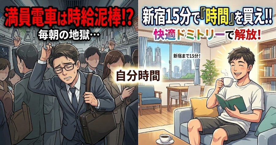 これから話す内容は圧倒的な低コストで「新宿・渋谷まで15分」の立地に住み、1日往復2時間の自由時間を買い戻す『戦略的ドミトリー生活』をご提案しよう!